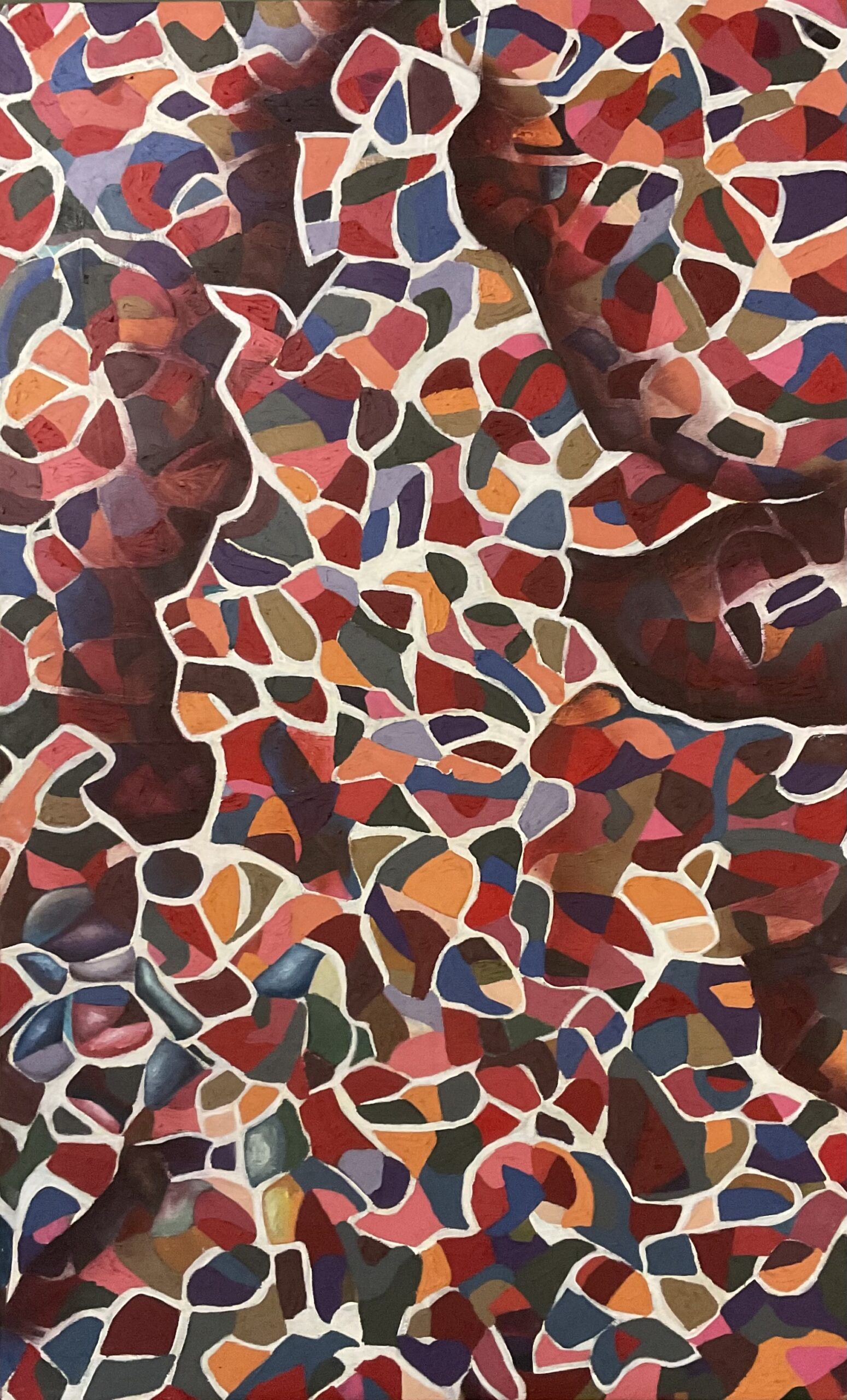 A cada pedaço, onde os planos se conectam em tema e construção, é possível se aventurar a escutar suas conversas. Eles dialogam entre si, estabelecendo vozes dadas em ressonância. Escuta-se com os olhos… E o que se vê são justamente as possibilidades abertas à diferença cravada na imensidão dos tons interligados pelas flores. São sons, pois os espaços vibram, se relacionam num movediço estar em séries. Espaço: pétalas em planos de cores e linhas, deixando seus limites jogarem, uns sobre os outros, o sereno embaralhamento das geometrias criadas em sobreposições. Eis, então, a emergência, ou a reinserção, da “lógica” disposta pela convergência das variações. Elas convergem, mas variando fronteiras quase infinitesimais, soltas dentro de limites em pleno movimento. Superfície plana, sem profundidade: “superficialidade” que se cria na dança com o profundo. Eis mais uma das questões levantadas pelos espaços. Mundo das camadas sobrepostas, dos diálogos das cores, há de se inventar a profundidade a cada deslocamento do olhar. Mas a profundidade não está disposta no suporte, ou numa impessoalidade perspectiva; a profundidade, ao contrário e, nesse caso, mais real e intensa, se faz por meio do encontro entre quem vê e o que a artista faz aparecer. Há, portanto, o “interior” de um espaço dobrado sobre si mesmo, num “profundo” pelo qual o movimento é essencialmente o do perder-se da superfície, encontrando, ao mesmo tempo, a entrada para outras possibilidades de percepção: são movimentos, ressonâncias, falas, significados, todas essas ações num mesmo e impreciso instante. E se o que vemos é repetição a produzir diferenças, é singularização, é ressonância e profundidade na superfície plana, tudo isso se dá pelo inevitável das imagens ao nos exigirem a relação com o que é visto. Talvez, arriscando uma síntese, a palavra mestra diante das obras seja mesmo “relação”, ou melhor, a necessidade incontrolável de “termos que nos relacionar” com as formas e as cores diante de nossos olhos.”